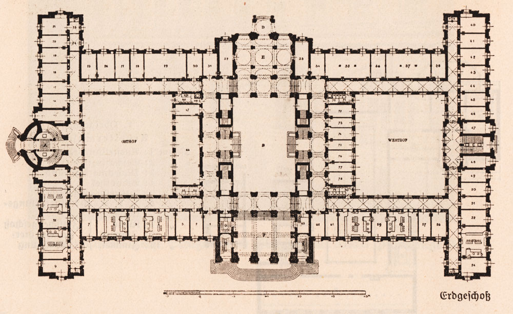Erdgeschoss-Plan des Münchner Justizpalastes. (aus: Bayerischer Architekten- und Ingenieurverein (Hrsg.): München und seine Bauten, S. 468)