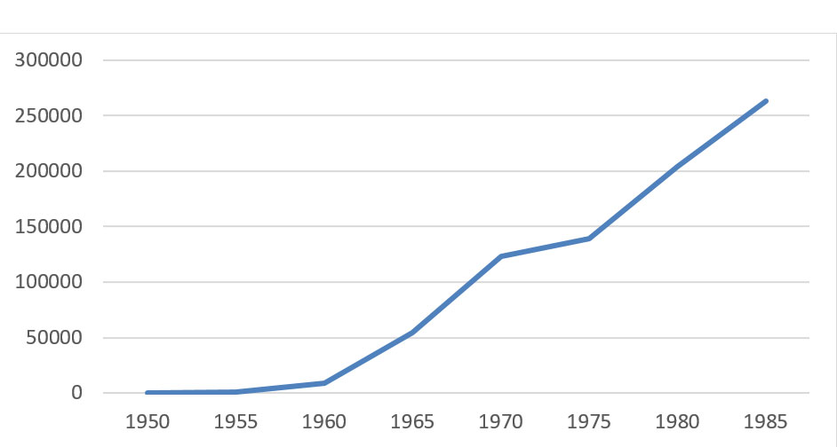 Ein- und Durchfahrten aus der Tschechoslowakei nach Bayern (KFZ insgesamt) 1950 bis 1985. (Quelle: Statistisches Jahrbuch für Bayern. Graphik: Markus Meinke) HLB