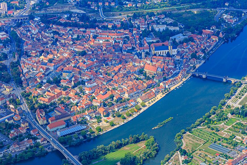 Luftaufnahme der ehemals hochstiftisch-würzburgischen, aber lange verpfändeten Stadt Kitzingen im Jahr 2015. (© Ingo Baeuerlein, FrankenAIR.de) HLB
