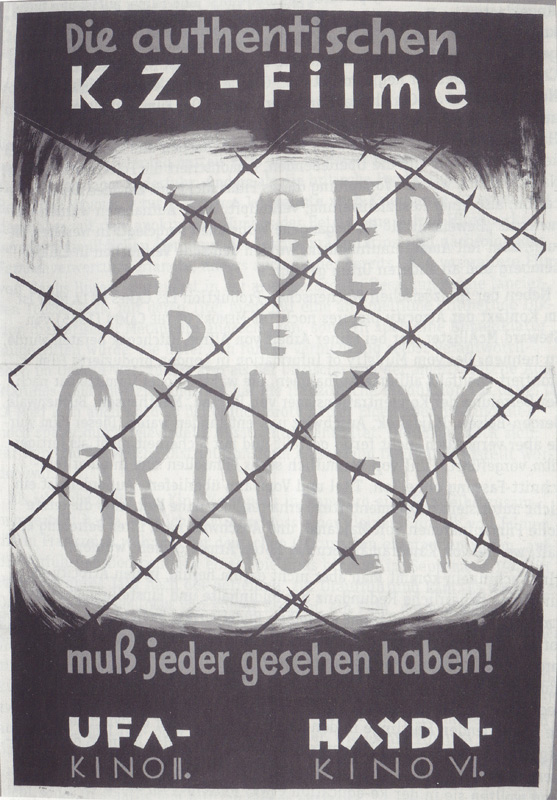 Plakat zum Reeducation-Einsatz des Films "Lager des Grauens" in Österreich. Es handelte sich um eine Zusammenstellung von "Die Todesmühlen" (D 1945), "Oswenzim" (Auschwitz, SU 1945) von Jelisaweta Swilowa sowie eines noch nicht identifizierten Films "Menschenschlachthöfe des III. Reiches". Abb. aus: Roß, Heiner (Hg.): Lernen Sie diskutieren! Re-education durch Film. Strategien der westlichen Alliierten nach 1945, 95. (Amtsbibliothek der Landespolizeidirektion Wien) HLB
