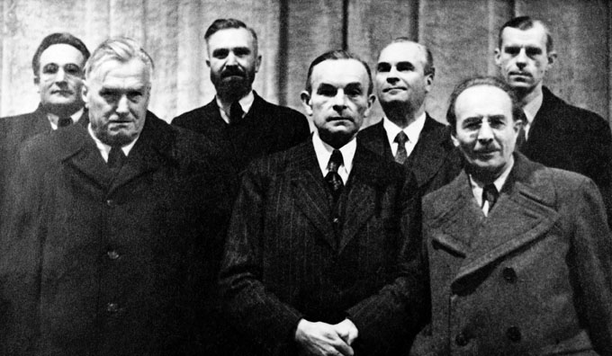 {{|1=Das Kabinett Ehard 1946: (v.l.) Baumgartner, Roßhaupter, Hundhammer, Ehard, Seifried, Hoegner, Loritz (©Bildarchiv Bayerischer Landtag, Bildnr. AA02634A).}}