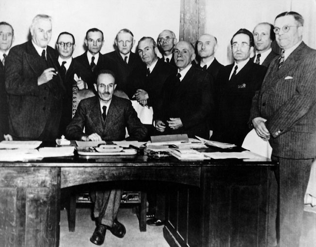 Gruppenaufnahme des Kabinetts Hoegner I, dass vom 22.10.1945 bis zum 16.12.1946 die bayerische Staatsregierung bildete. Von links nach rechts: Ludwig Ficker, Albert Rosshaupter, Anton Pfeiffer, Hans Ehard, Ludwig Erhard, Josef Seifried, Franz Fendt, Fritzs Terhalle, Heinrich Krehle, Josef Baumgartner, Heinrich Schmitt, Hans Mueller. Sitzend: Wilhelm Hoegner. (©Bildarchiv Bayerischer Landtag, Bildnr. AA02615A)