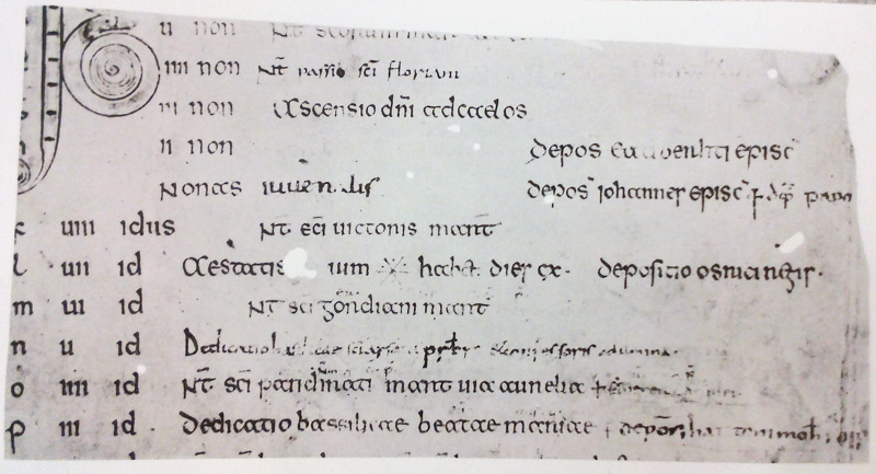 Angelsächsisches Kalendarfragment mit nekrologischen Notizen. Erste Hälfte 8. Jhdt. Nachträge legen eine Verwendung der Handschrift in den Klöstern Tegernsee oder Ilmmünster nahe. (Ehem. Bayerisches Hauptstaatsarchiv, Raritätenselekt 108, seit 1939 verschollen. Abb. aus: The Earlier Latin Manuscripts Project lizenziert durch CC BY-NC 4.0) HLB