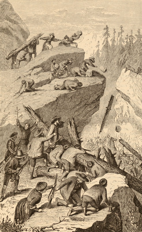 Kämpfe in der Eisacktalschlucht südlich von Sterzing, sogenannte "Sachsenklemme". (Tiroler Landesmuseen, Bibliothek des Ferdinandeums, FB 6504/52) HLB