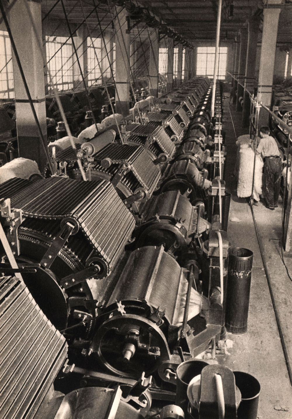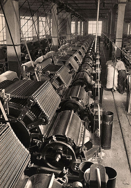 In der Karderie wird die Wolle von den Wickel zu Faser-Flies verarbeitet, das zu einer weichen Lunte zusammengefasst wird. (aus: Hundert Jahre Mechanische Baumwollspinnerei und Weberei Augsburg, München 1937, S. 222)