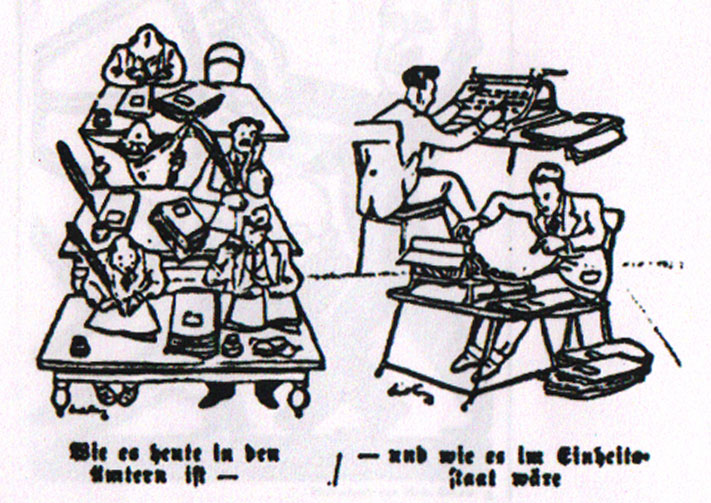 Karikatur, die mit dem zeitgenössischen Effizienzversprechen für den Einheitsstaat wirbt (Bayerisches Hauptstaatsarchiv München MA 1943/103330; erschienen in: Süddeutsche Sonntagspost Nr. 4, 1928, S.3).