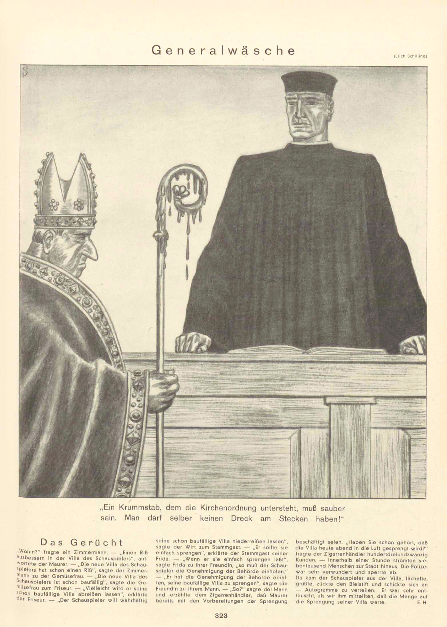 Knapp drei Wochen nach Joseph Goebbels antiklerikaler Massenveranstaltung im Berliner Sportpalast erschien im Simplicissimus diese Karikatur, die suggerierte, dass auch der hohe Klerus sich sittlichen Fehlverhaltens schuldig gemacht habe. In welcher Weise – ob als unmittelbar Tatbeteiligte oder die Taten begünstigende Hintermänner – bleibt hier offen. Karikatur von Erich Schilling (1885-1945). (Simplicissimus Jg. 42, Nr. 24, 20.06.1937, 11) HLB