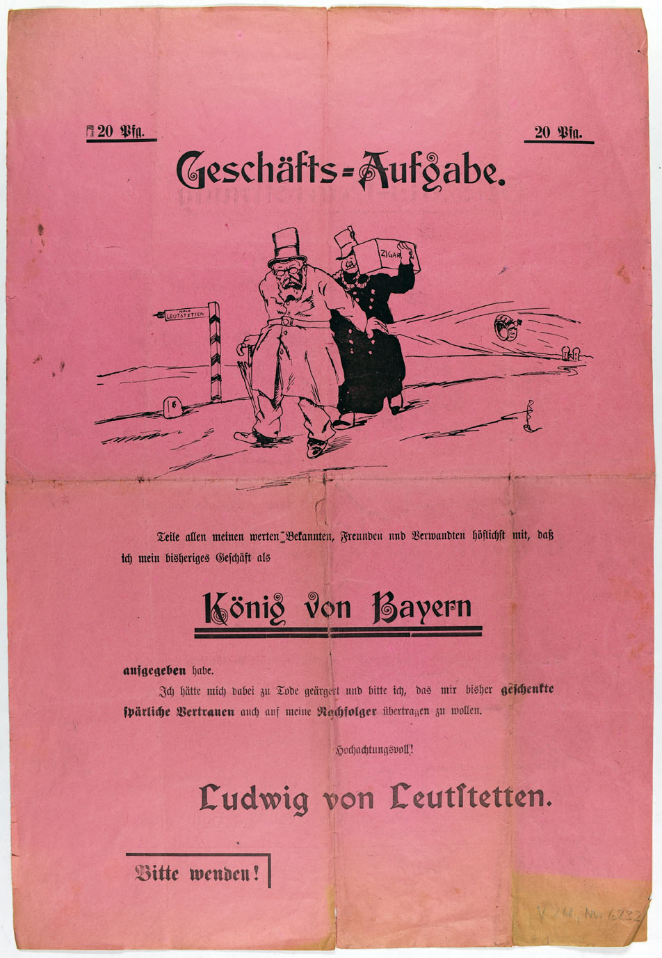 Diese Karikatur thematisieret die Abdankung des bayerischen Königs Ludwig III. im Jahre 1918 unter de Titel "Geschäftsaufgabe". (Landesarchiv Speyer, Y 24, Nr. 6232, Vorderseite)
