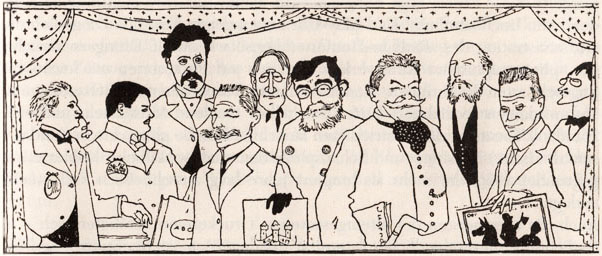 Karikatur Münchner Verleger um 1912. Von links: Georg Müller, Hans von Weber, F. Hanfstaengl, Oldenbourg, Heinrich Beck, J. F. Lehmann, Georg Hirth, G. Callwey, Reinhard Piper, Korfiz Holm. (Archiv Piper Verlag)
