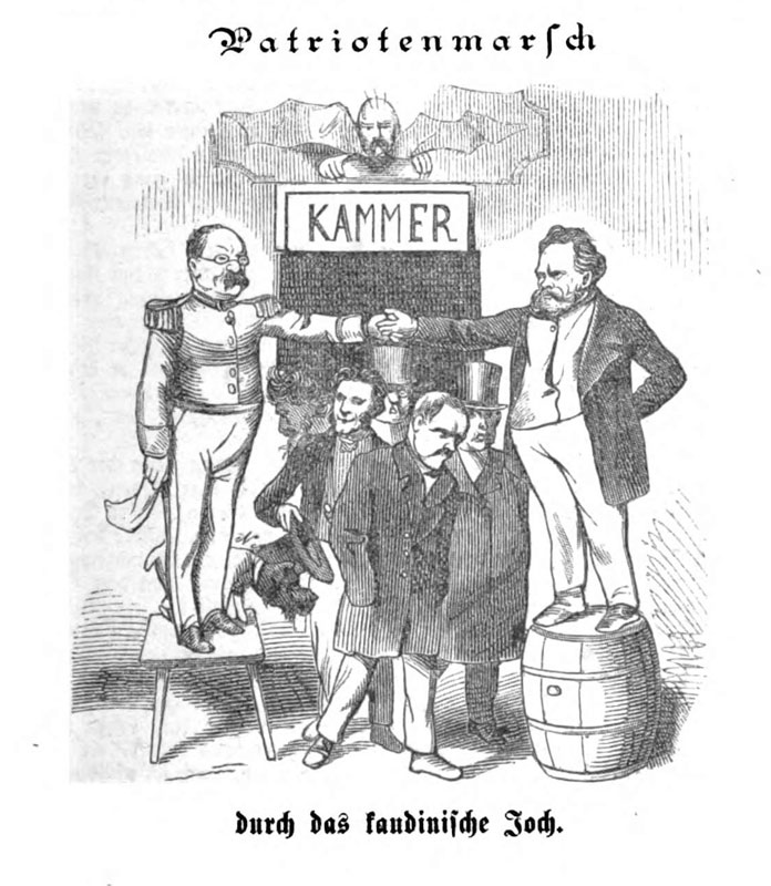 Karikatur "Patriotenmarsch durch das kaudinische Joch" auf das Abstimmungsverhalten der Patriotenpartei im April 1872. (Abb. aus: Die Bremse. Satirisch-humoristisches Wochenblatt Nr. 18 (4.5.1872), 137)
