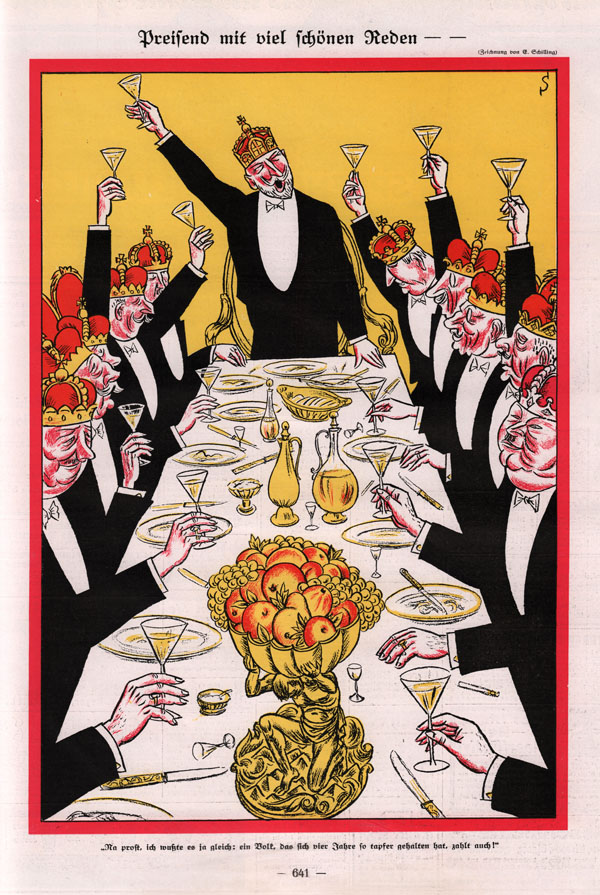 Karikatur "Preisend mit viel schönen Reden", die aus Anlass der Volksabstimmung erschien. Zeichnung von Erich Schilling. Abb. aus: Simplicissimus 30 (1926), Heft 44 vom 1.2.1926, 641. (Bayerische Staatsbibliothek, 2 Per. 18 pe-30,1)