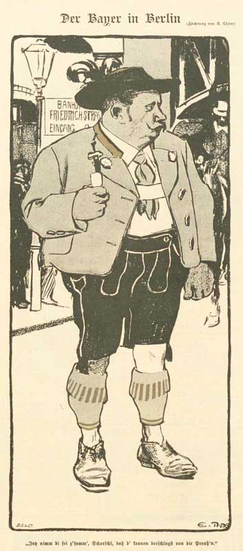 Karikatur "Der Bayer in Berlin", Zeichnung von Eduard Thöny (1866-1950), 1899. (Abb. aus Simplicissimus 12.1899, 305)