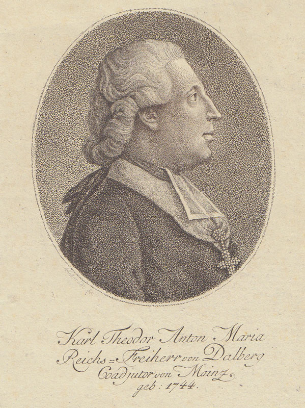 Karl Theodor Reichsfreiherr von und zu Dalberg (1744-1817), 1787 Koadjutor des Erzbischofs von Mainz, von 1802 bis 1806 Kurfürst von Mainz bzw. Regensburg und ab 1806 Fürstprimas des Rheinbundes. Kupferstich in Punktiermanier von Vitus Jeremias Vockerodt (geb. 1772). (Stadt- und Stiftsarchiv Aschaffenburg, Grafiksammlung)