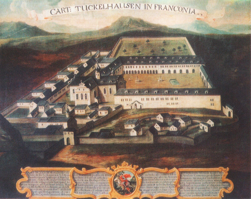 Die Kartause Tückelhausen (Stadt Ochsenfurt, Lkr. Würzburg) auf einem Ölgemälde aus dem Jahre 1754. (Kath. Pfarramt St. Georg).