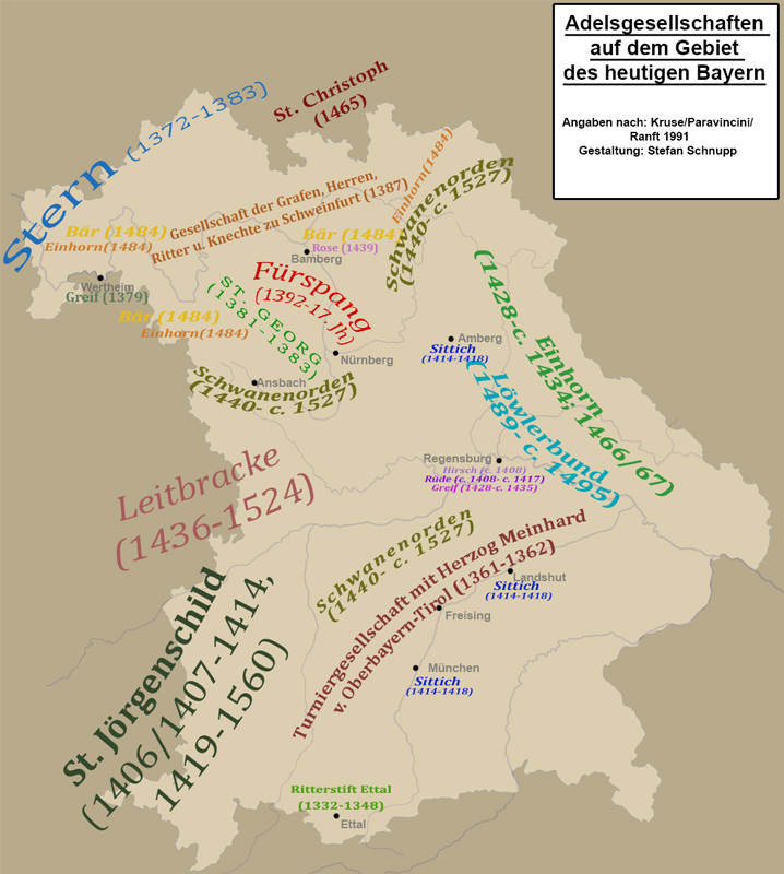 Adelsgesellschaften auf dem Gebiet des heutigen Bayern. (Gestaltung: Stefan Schnupp, Angaben nach: Kruse/Paravincini/ Ranft 1991)