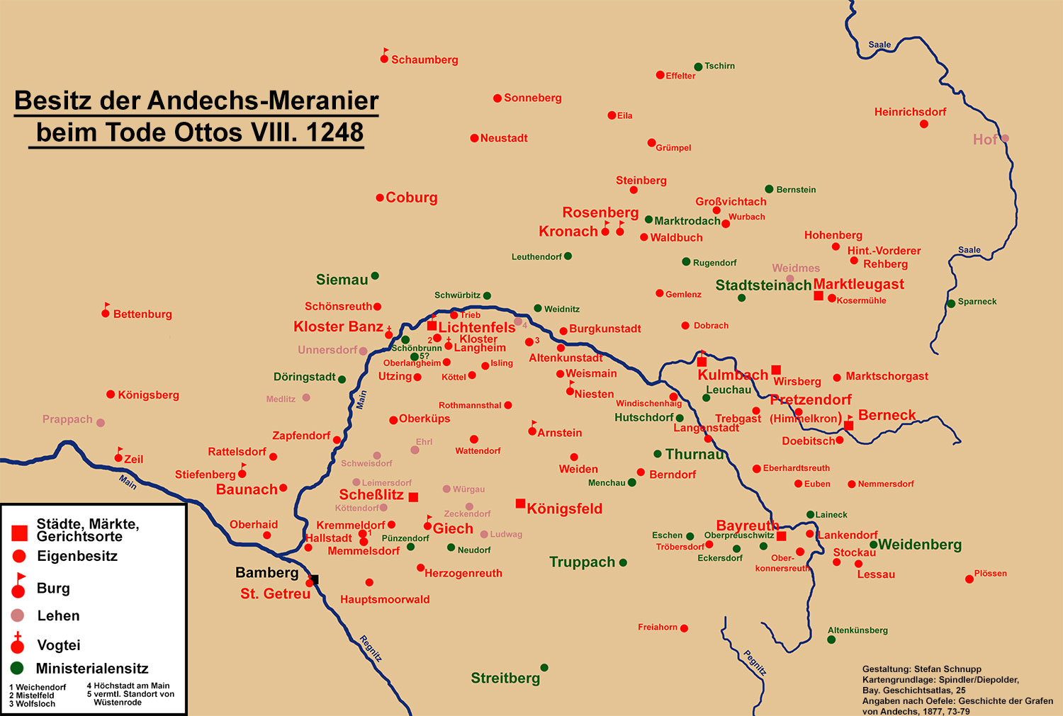 Besitzungen der Andechs-Meranier beim Tode Ottos VIII. 1248 in Franken. (Gestaltung: Stefan Schnupp; Kartengrundlage: Spindler/Diepolder, Bay. Geschichtsatlas, 25; Angaben nach: Oefele: Geschichte der Grafen von Andechs, 1877, 73-79)