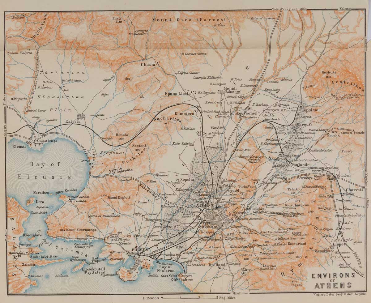 Karte der Umgebung Athens, 1889. In der heutigen Athener Vorstadt Iraklion (Arakli, auch Arakläa genannt) siedelte König Otto Veteranen seines Hilfskorps an. Die Siedlung blieb auch nach dem Ende von Ottos Herrschaft erhalten. 18632 lebten hier 15 deutsche Familien, aber die deutsche Sprache beherrschte zu diesem Zeitpunkt hier kaum noch jemand. Karte aus: Greece: Handbook for travellers by Karl Baedeker. With a panorama of Athens, 6 maps and 14 plans. (Bayerische Staatsbibliothek, It.sing. 1290 g) HLB
