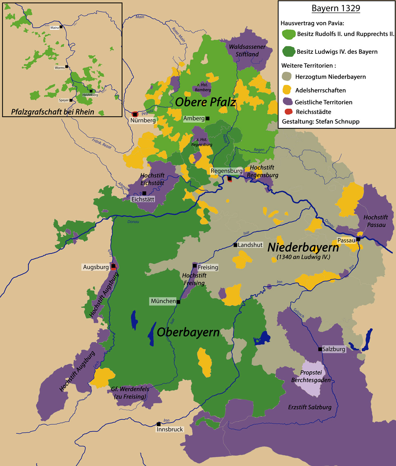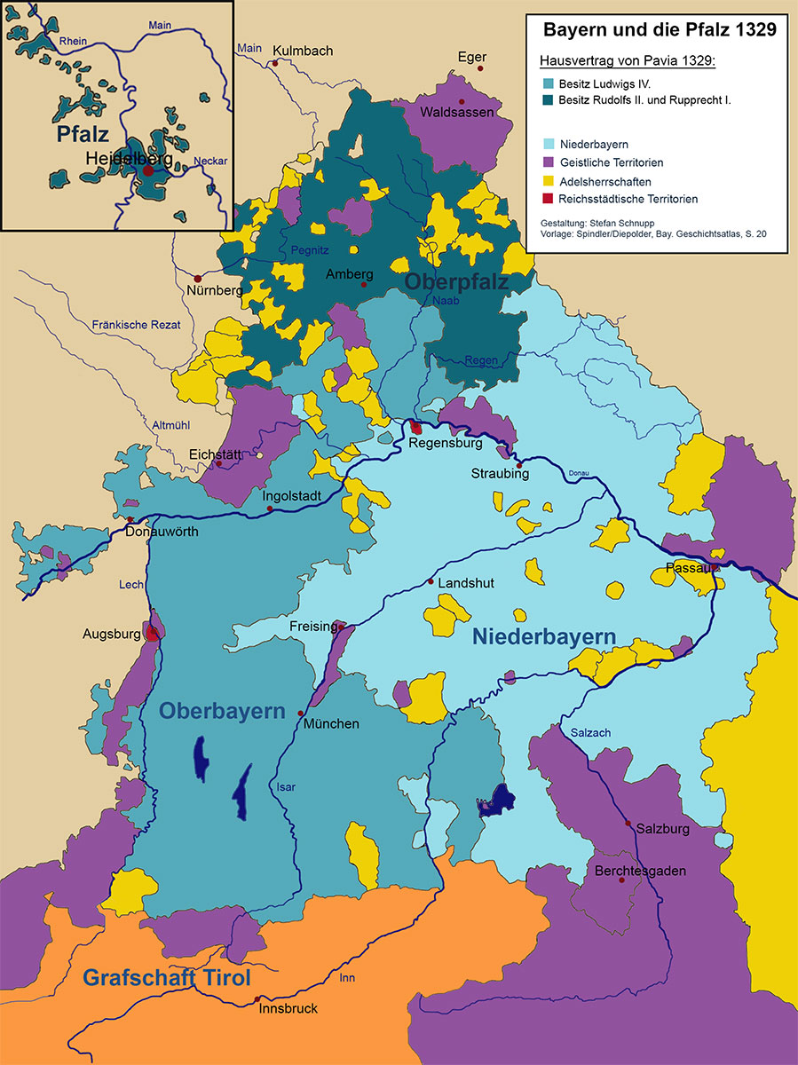 Bayern 1329, nach dem Hausvertrag von Pavia. (Gestaltung: Stefan Schnupp; Vorlage: Spindler u. Diepolder, Bayer. Geschichtsatlas, München 1969, 20; Angaben zur Pfalz nach: Schaab, Territoriale Entwicklung der Kurpfalz von 1156 bis 1792, in: Historischer Atlas von Baden-Württemberg, Stuttgart 1972-1988) HLB