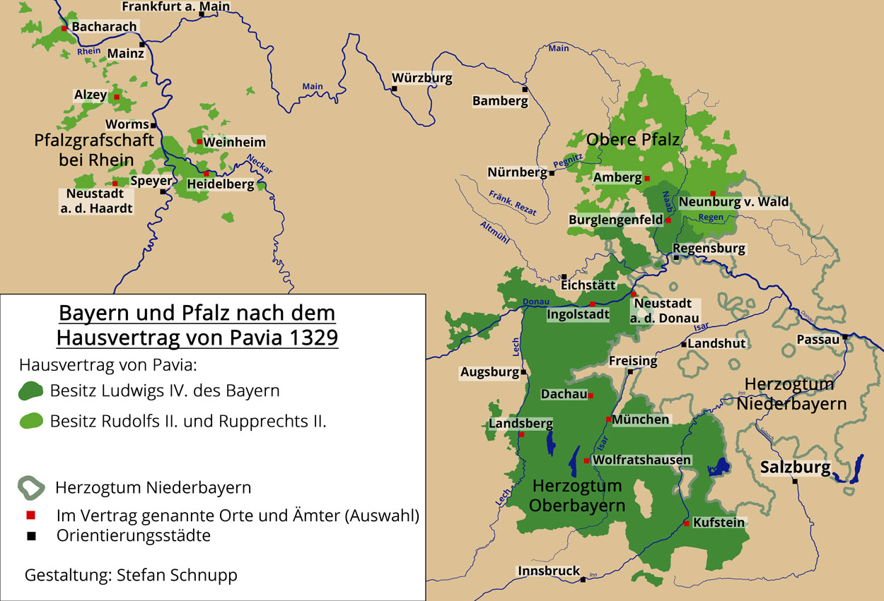 Bayern und Pfalz nach dem Hausvertrag von Pavia 1329. (Gestaltung: Stefan Schnupp) HLB