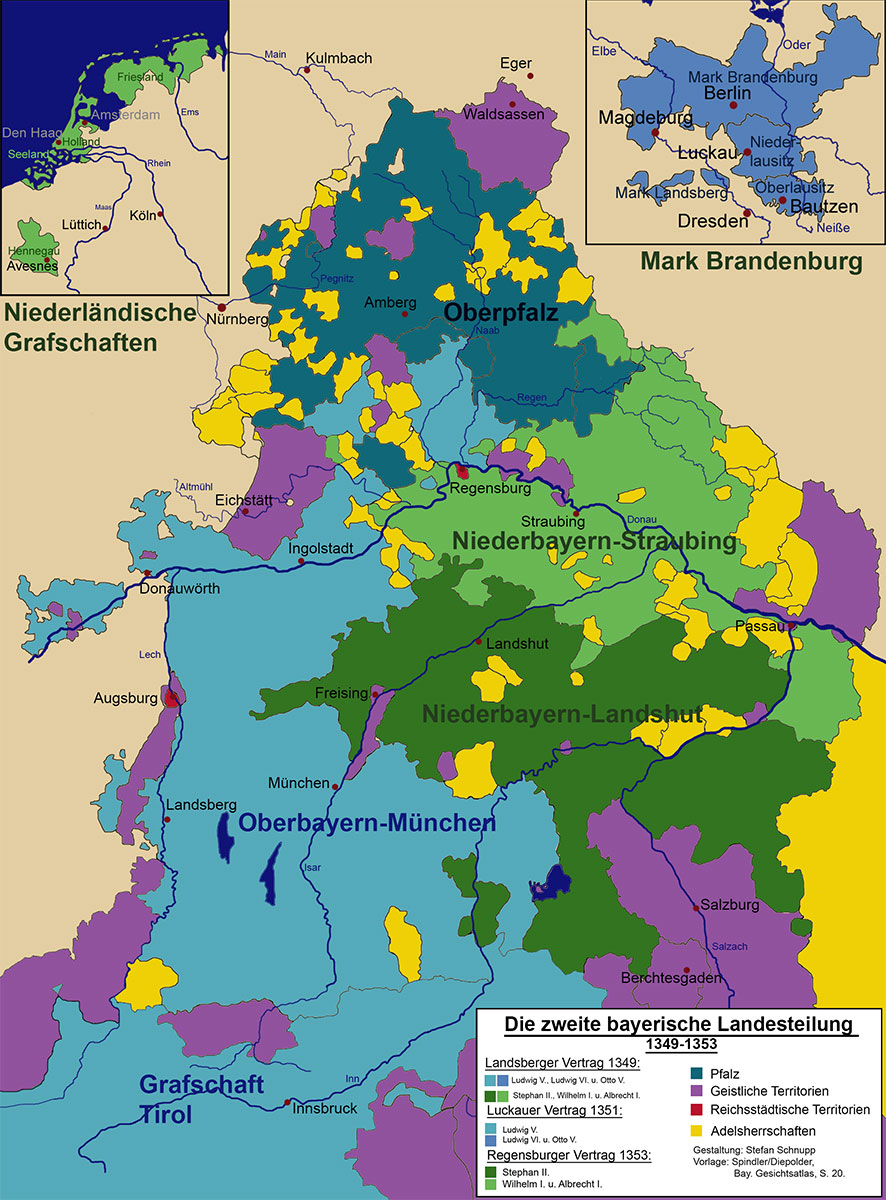 Bayern nach der zweiten Bayerischen Landesteilung (1349-1353). (Gestaltung: Stefan Schnupp; Vorlage: Spindler u. Diepolder, Bayer. Geschichtsatlas, München 1969, 20; Weitere Angaben nach: Dorit-Maria Krenn, Niederbayern-Straubing-Holland, Herzogtum (1353-1425); Maximilian Dörrbecker, Karte der Mark Brandenburg um 1320) HLB