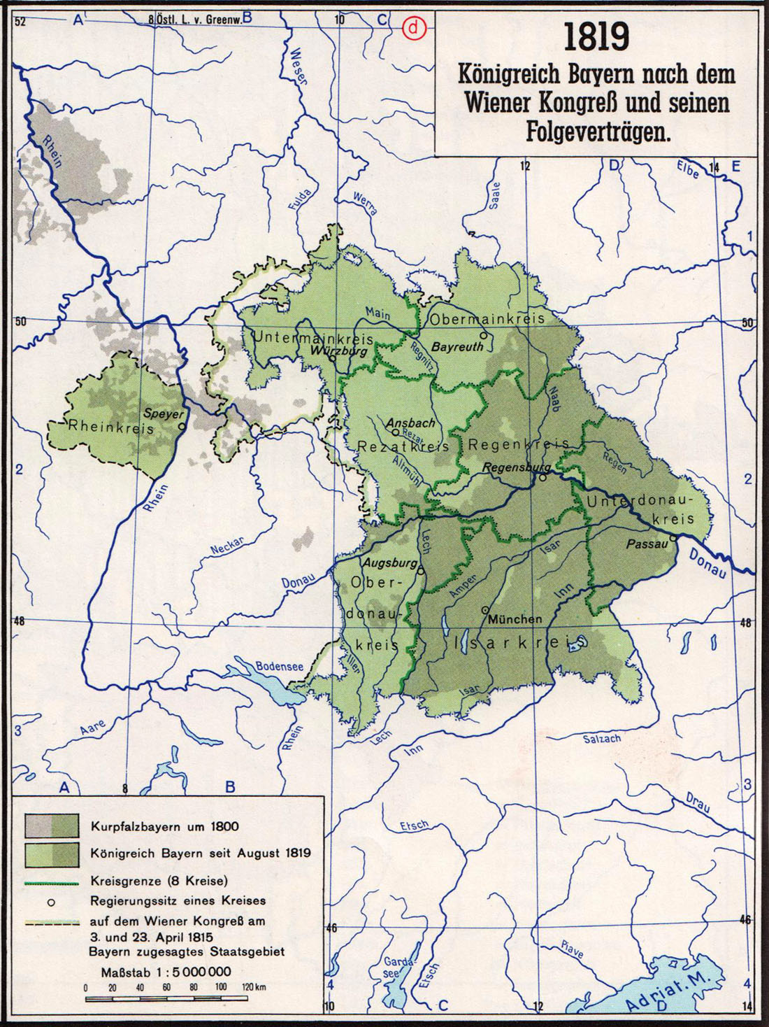 Das Königreich Bayern nach dem Wiener Kongress und dessen Folgeverträgen. (aus: Spindler, Max (Hrsg.): Bayerischer Geschichtsatlas, München 1969, S. 36)