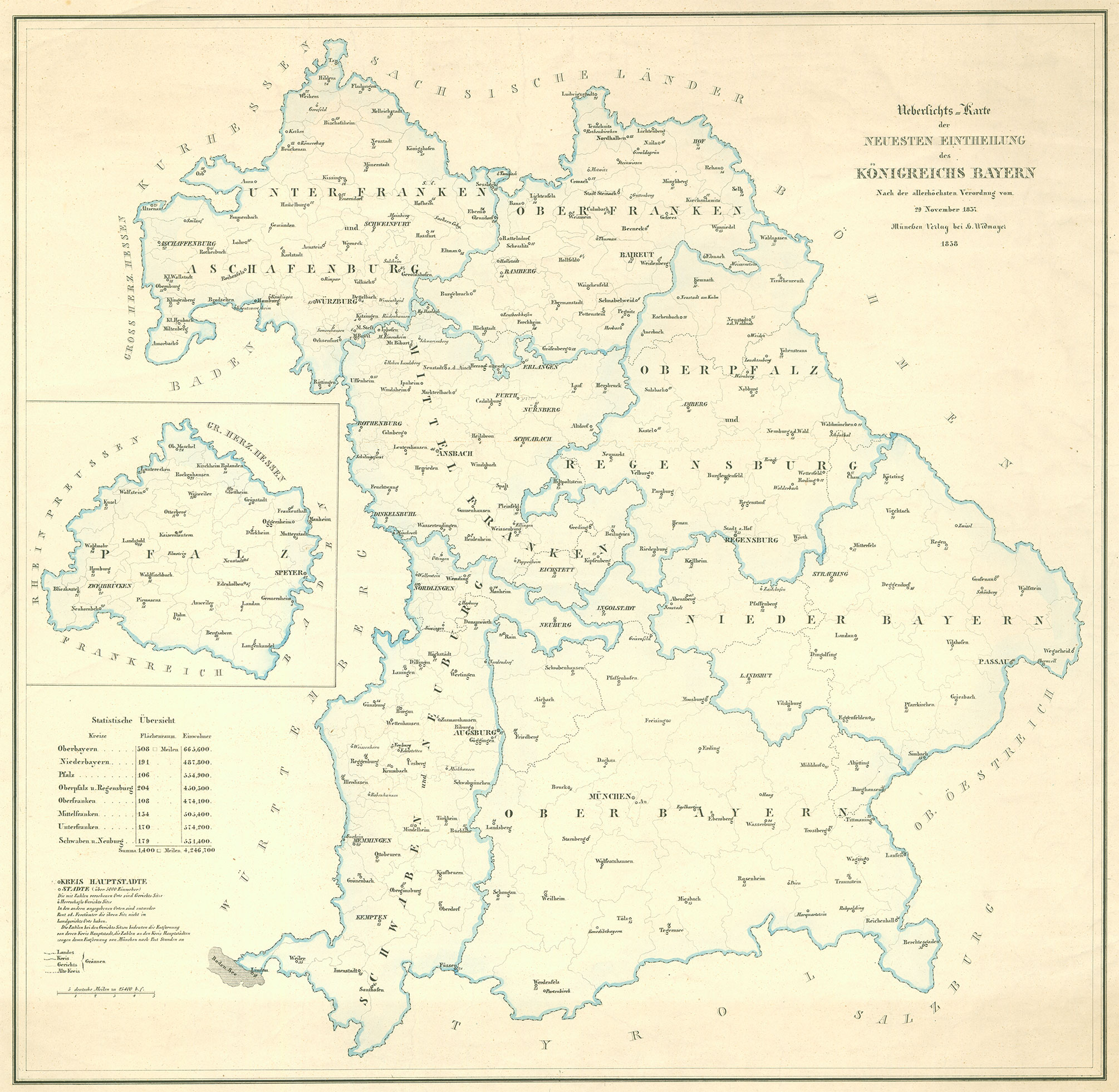 Uebersichts-Karte der Neuesten Eintheilung des Königreichs Bayern. Nach der allerhöchsten Verordnung vom 29.November 1837. Karte von Heinrich Widmayer, München 1838. (Bayerische Staatsbibliothek, Mapp. XI,65)