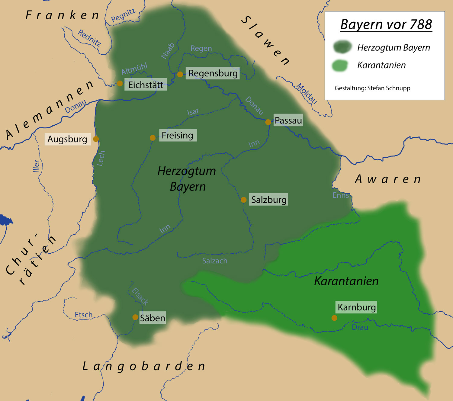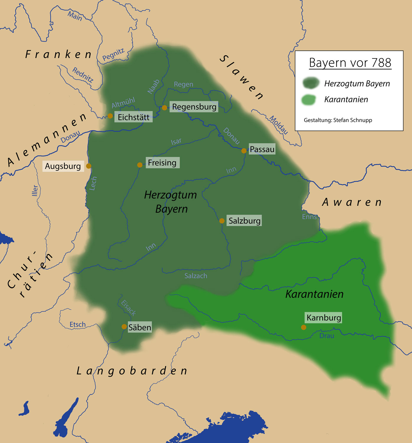 Bayern vor 788. (Gestaltung: Stefan Schnupp; Vorlagen: Spindler u. Diepolder, Bayer. Geschichtsatlas, München 1969, 15; Angaben nach: Fehr u. Heitmeier, Die Anfänge Bayerns, St. Ottilien 2. Auflage 2014, Nachsatz) HLB