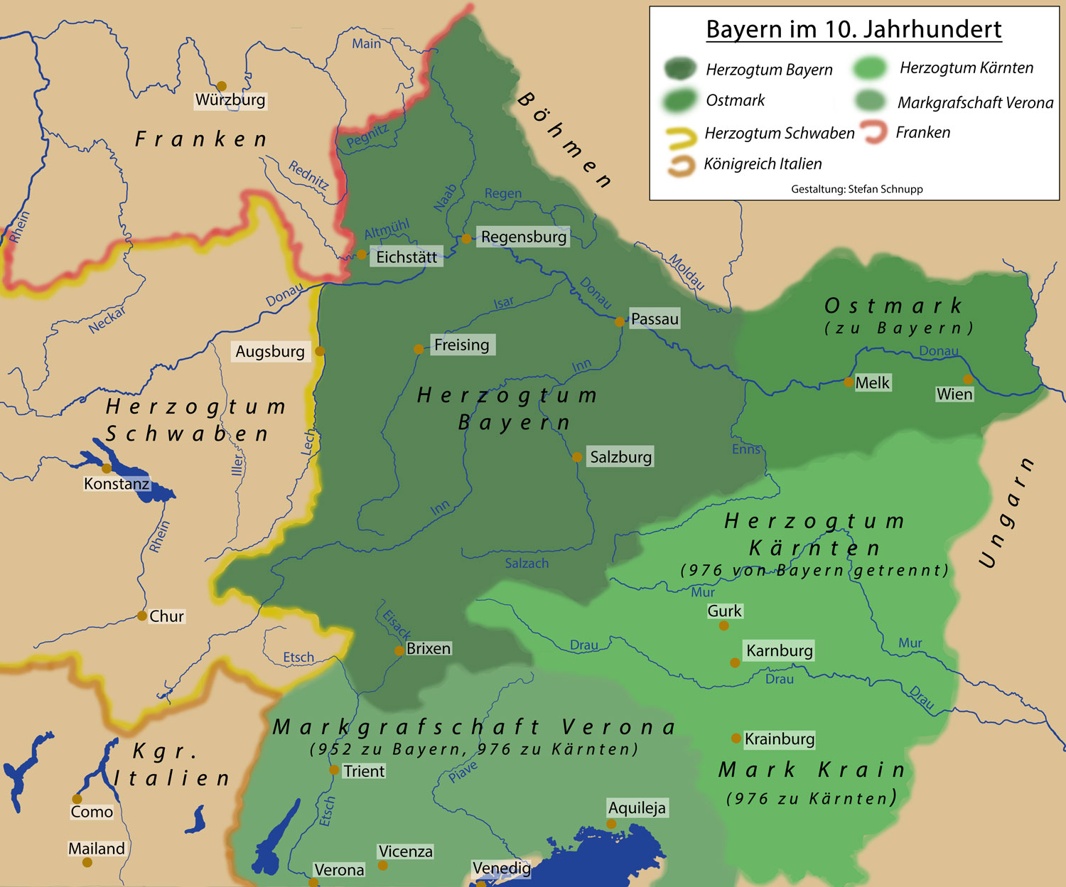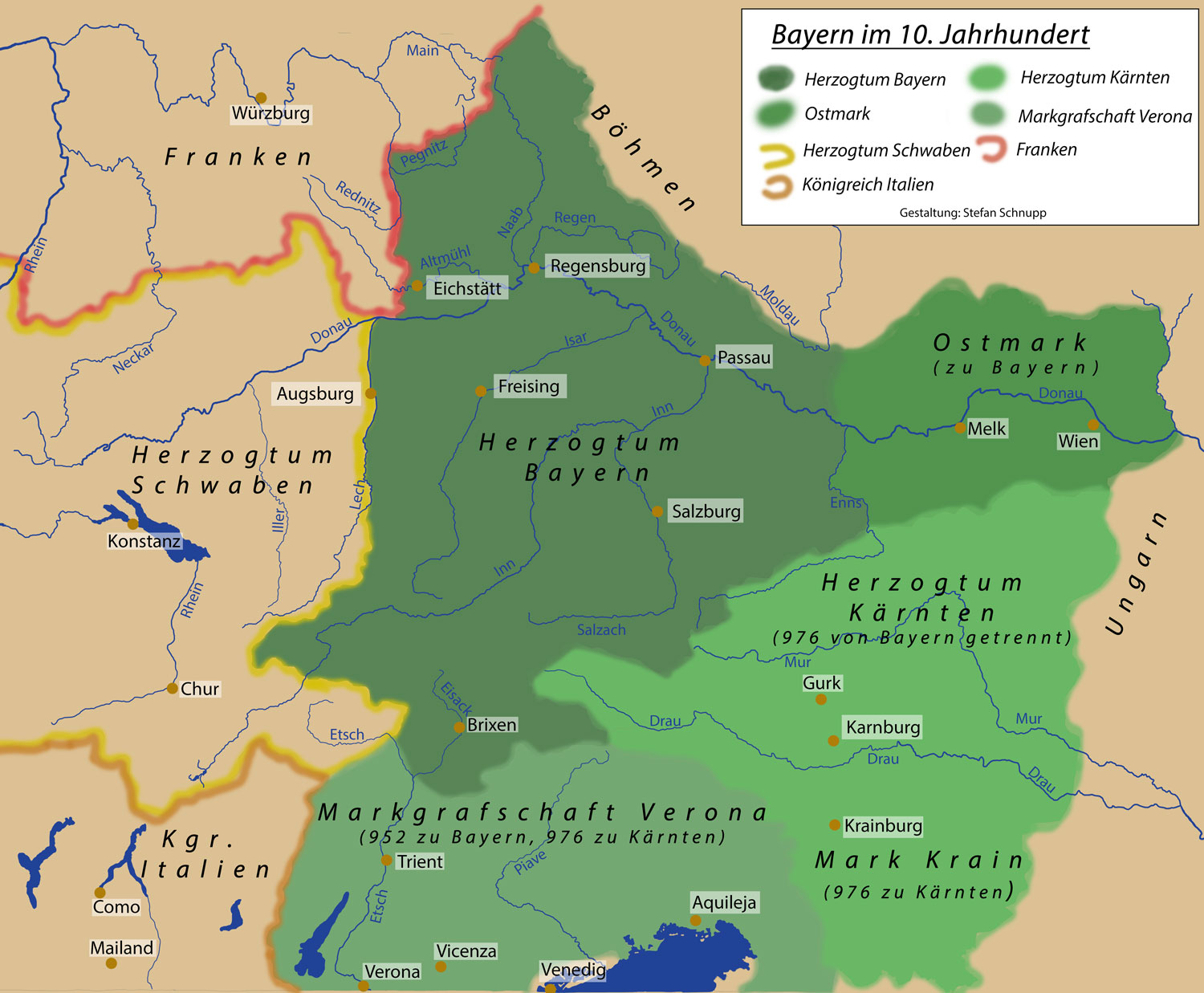 Bayern im 10. Jahrhundert. (Gestaltung: Stefan Schnupp; Vorlage: Spindler u. Diepolder, Bayer. Geschichtsatlas, München 1969, 15) HLB