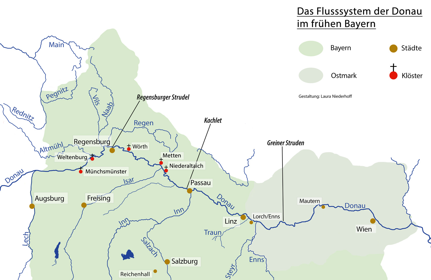 Das Flusssystem der Donau im Bereich des frühmittelalterlichen Bayern mit für die frühe Schifffahrt wichtigen Orten, Klöstern und natürlichen Hindernissen. (Gestaltung: Laura Niederhoff) HLB