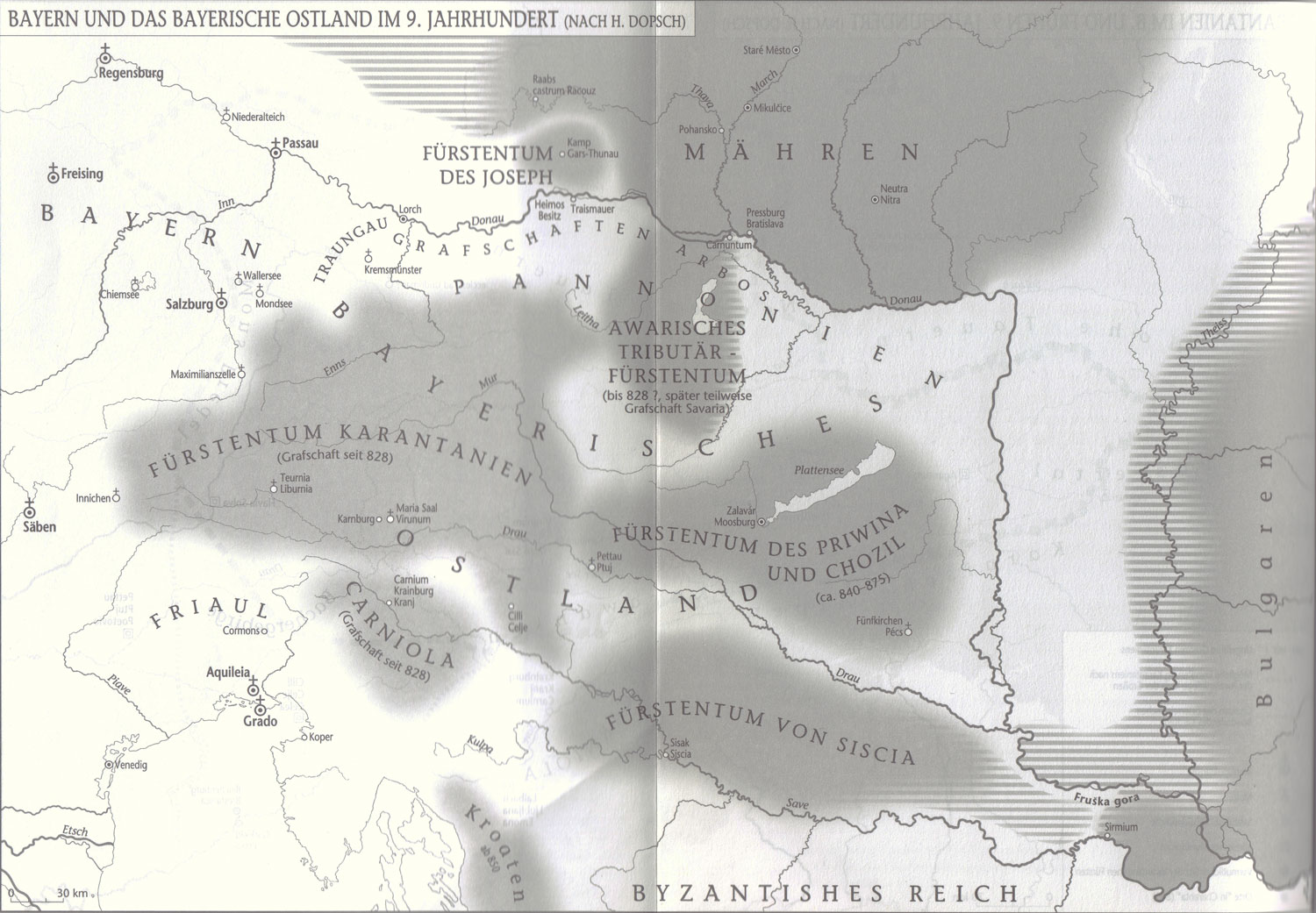 Bayern und das Bayerische Ostland im 9. Jahrhundert. Abb. aus: Herwig Wolfram, Conversio Bagoariorum et Carantanorum, Ljubljana 2012. (Mit Genehmigung des Autors abgedruckt)