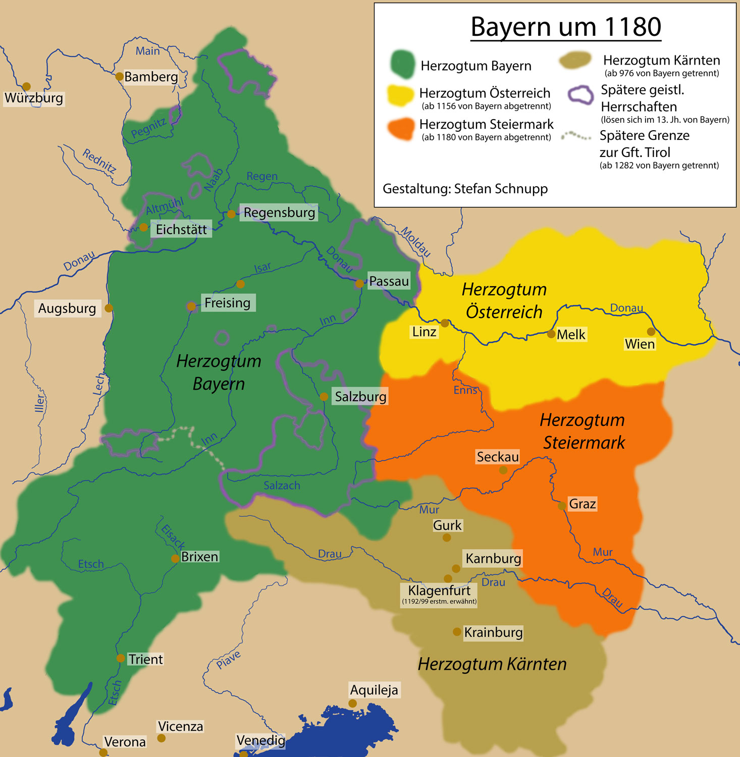Bayern um 1180. (Gestaltung: Stefan Schnupp; Vorlage: Spindler u. Diepolder, Bayer. Geschichtsatlas, München 1969, 15; Angaben nach: Jahn u. Brockhoff, Verbündet - Verfeindet – Verschwägert. Bayern und Österreich, Augsburg 2012, Bd. 1, 152) HLB