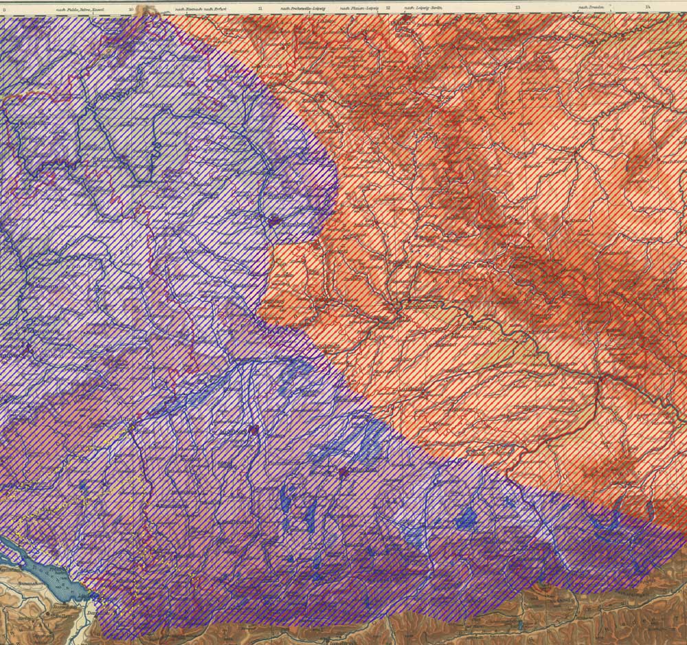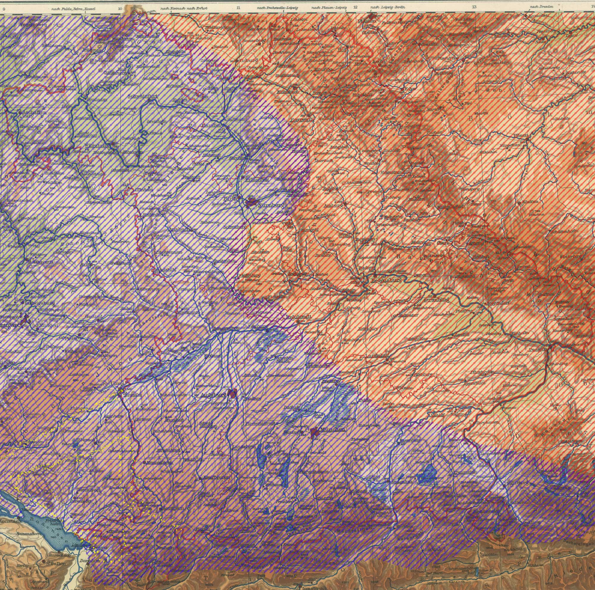 Karte mit dem Verlauf der Demarkationslinie der 3. (rot) und 7. (blau) US-Armee in Bayern sowie Bewegungen der Französischen Streitkräfte (gelb), 1945. (Kartenvorlage: Freistaat Bayern, Westermann, Braunschweig, ca. 1920. Bayerische Staatsbibliothek, Mapp. XI,20 b lizenziert durch CC BY-NC-SA 4.0) HLB