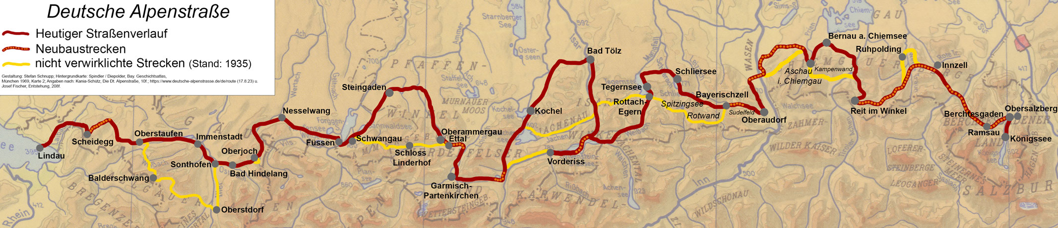 Karte des geplanten und verwirklichten Streckensverlaufs der Deutschen Alpenstraße. (Gestaltung: Stefan Schnupp; Hintergrundkarte: Spindler / Diepolder, Bay. Geschichtsatlas,München 1969, Karte 2; Angaben nach: Kania-Schütz, Die Dt. Alpenstraße, 10f.; https://www.deutsche-alpenstrasse.de/de/route (17.8.23) u. Josef Fischer, Entstehung, 208f.) HLB