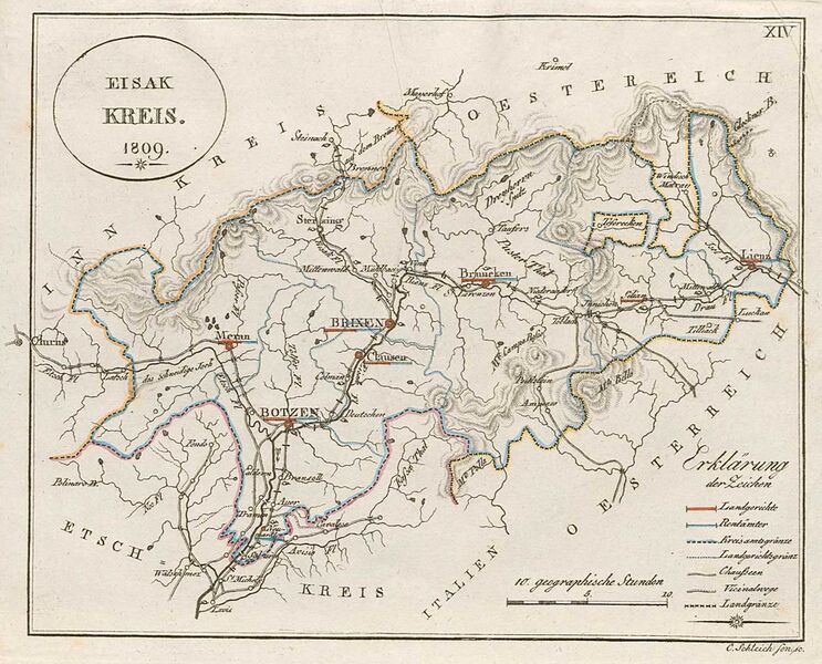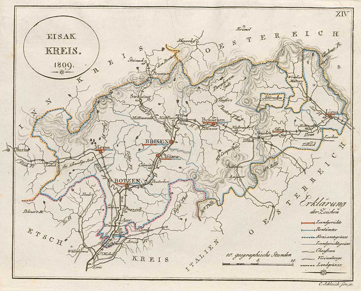 Karte des Eisackkreises und seiner Landgerichte von 1809. Abb. aus: Alois Senefelder u.a., Das Königreich Baiern. In fünfzehen Kreise eingetheilt, nebst einer Uebersichts-Karte, München 1809. (Bayerische Staatsbibliothek, Mapp. XI,50 o)