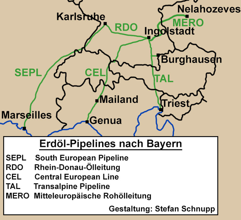 Karte der nach Bayern führenden Erdöl-Pipelines. (Gestaltung: Stefan Schnupp)