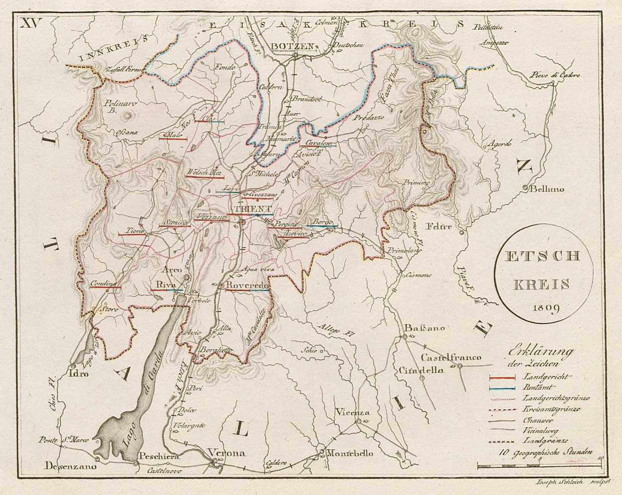 Karte des Etschkreises und seiner Landgerichte von 1809. Abb. aus: Alois Senefelder u.a., Das Königreich Baiern. In fünfzehen Kreise eingetheilt, nebst einer Uebersichts-Karte, München 1809. (Bayerische Staatsbibliothek, Mapp. XI,50 o)