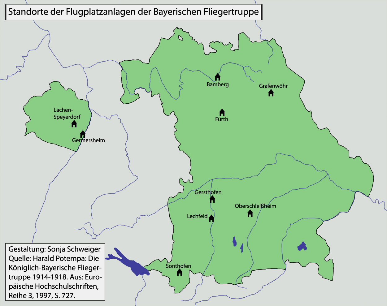 Standorte der Flugplatzanlagen der Bayerischen Fliegertruppe. Gestaltung: Sonja Schweiger. (Quelle: Potempa, Fliegertruppe) HLB
