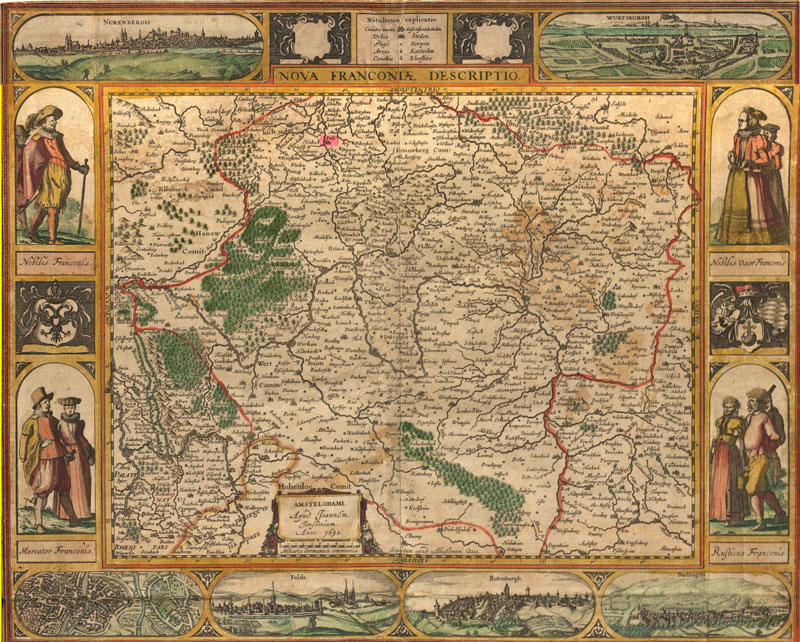 Karte von Franken mit Stadtveduten (u.a. Würzburg und Fulda), Kupferstich von A. Goos, 1626 (Vonderau Museum Fulda II F 110)