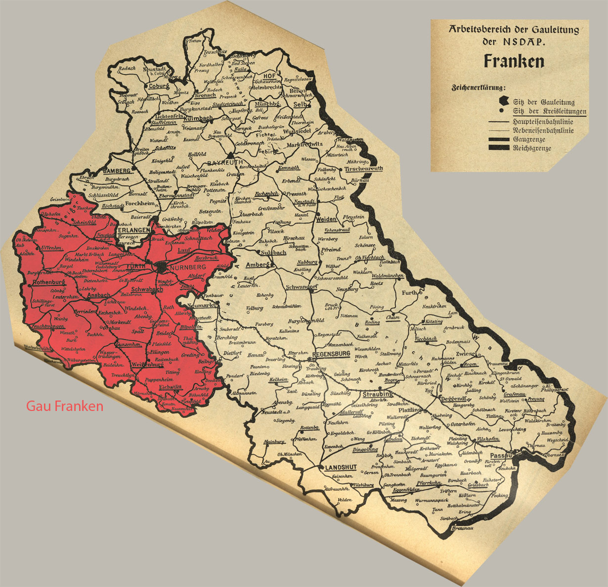 Gebiet des Gaus Franken (rot markiert). Abb. aus: Adressenwerk der Dienststellen der NSDAP mit den angeschlossenen Verbänden, des Staates, der Reichsregierung und Behörden und der Berufsorganisationen in Kultur, Reichsnährstand, gewerbliche Wirtschaft, Berlin 1937. (Bayerische Staatsbibliothek, 4 Z 38.81-1, Bearbeitung: Sonja Schweiger) HLB