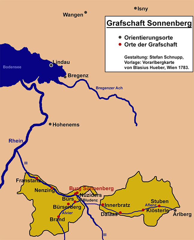 Karte der Grafschaft Sonnenberg. (Gestaltung: Stefan Schnupp, Vorlage: Vorarlbergkarte von Blasius Hueber, Wien 1783)