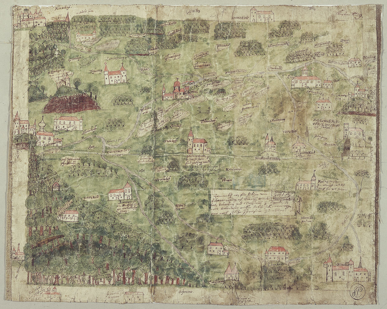 Handgezeichnete Karte der Herrschaft Schwarzenburg, Süden oben, ohne Maßstab und Datierung. Vermutlich aus der 2. Hälfte des 16. Jahrhunderts. Autor unbekannt. (Staatsarchiv Amberg, Plansammlung 1934)