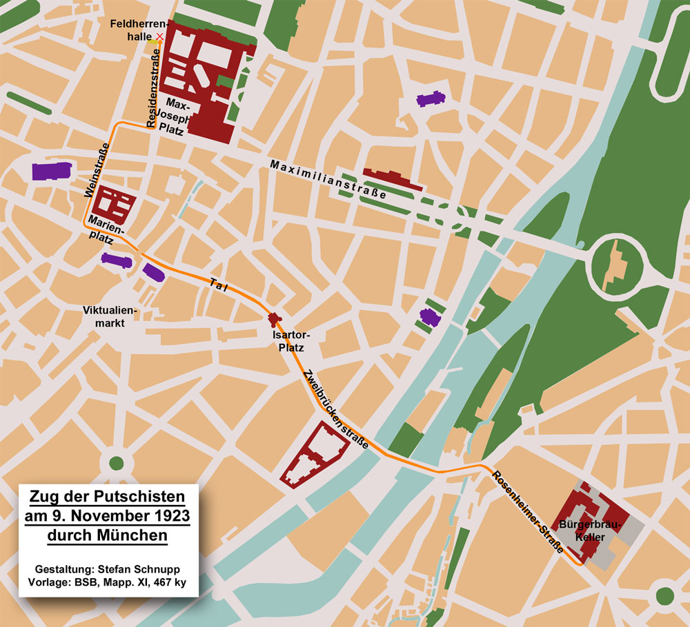 Zug der Putschisten am 9. November 1923 durch München. (Gestaltung: Stefan Schnupp, Vorlage: Bayerische Staatsbibliothek, Mapp. XI, 467 ky)