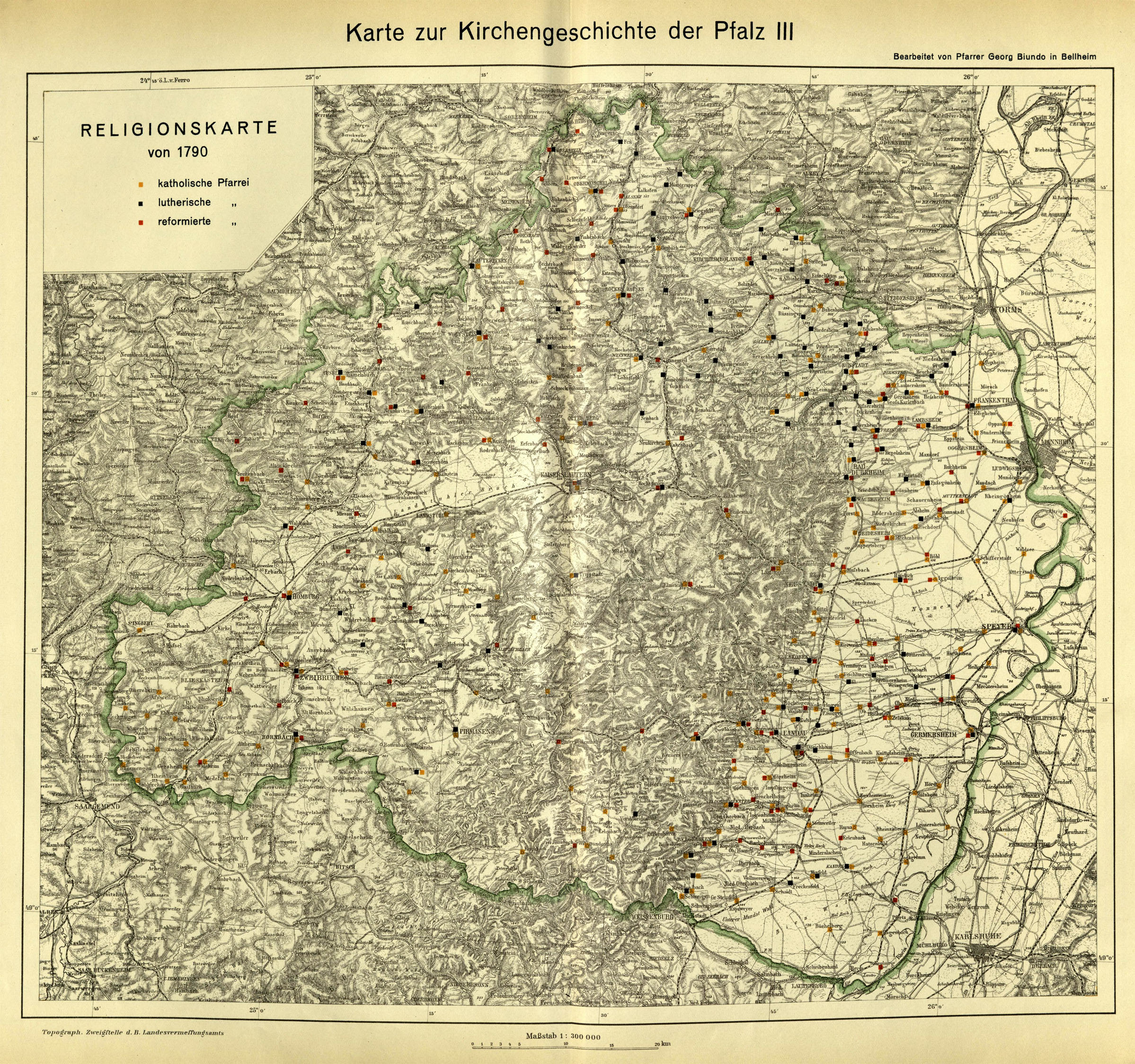Karte zur Kirchengeschichte der Pfalz. (Abb. aus: Wilhelm Winkler, Pfälzischer Geschichtsatlas, Neustadt an der Haardt 1935, Karte 21)