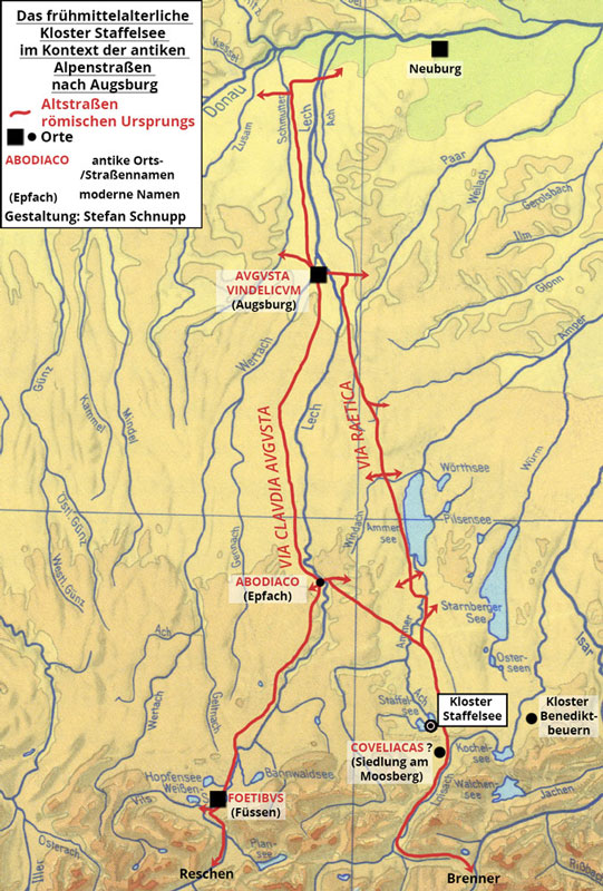 Das frühmittelalterliche Kloster Staffelsee im Kontext der antiken Alpenstraßen nach Augsburg. (Gestaltung: Stefan Schnupp) HLB