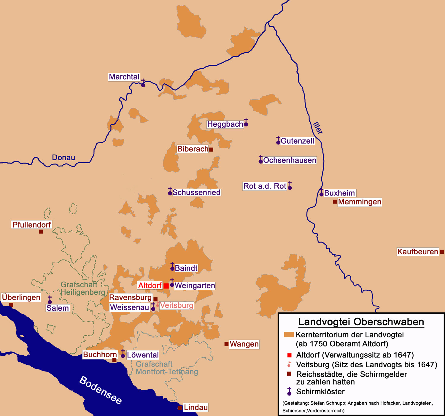 Karte der Landvogtei Oberschwaben (Gestaltung: Stefan Schnupp, Angaben nach: Hofacker, Landvogteien in Schwaben u. Schiersner, Vorderösterreich)