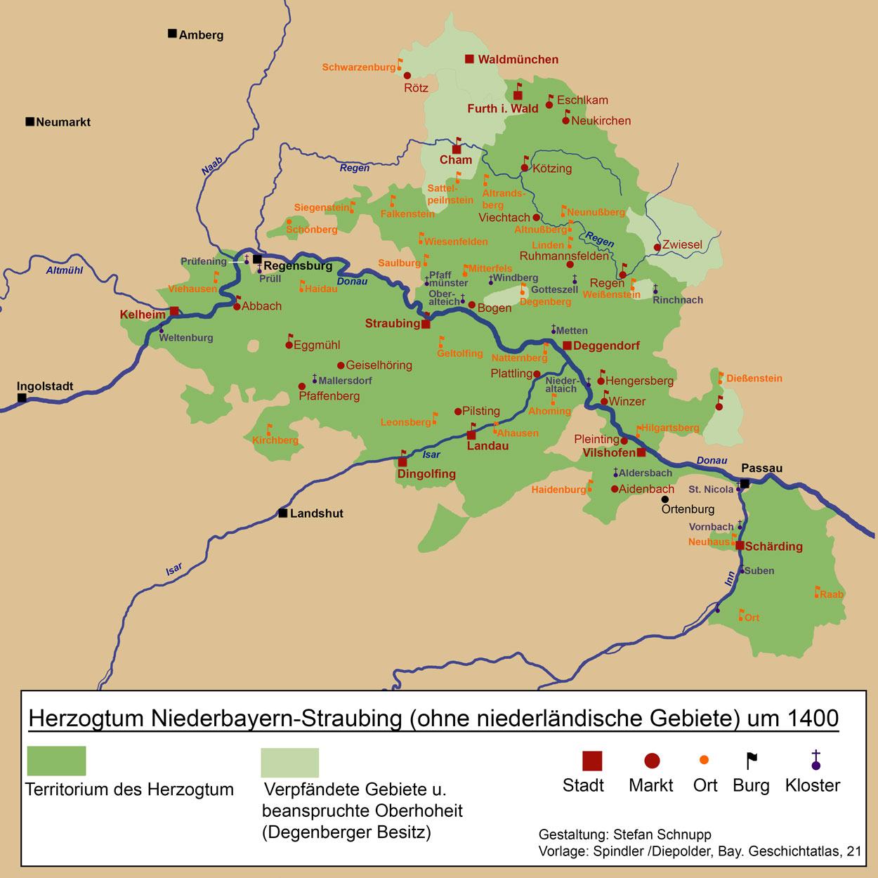 Das Herzogtum Niederbayern-Straubing um 1400 (Gestaltung: Stefan Schnupp; Vorlage: Spindler/Diepolder, Bay. Geschichtsatlas, 21)