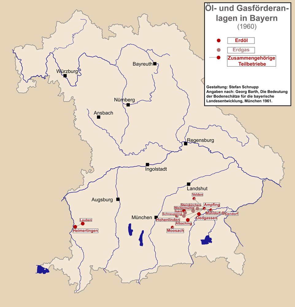 Karte mit den Erdöl- und Erdgasförderanlagen in Bayern 1960. (Gestaltung: Stefan Schnupp, Angaben nach: Georg Barth, Die Bedeutung der Bodenschätze für die bayerische Landesentwicklung, München 1961.)