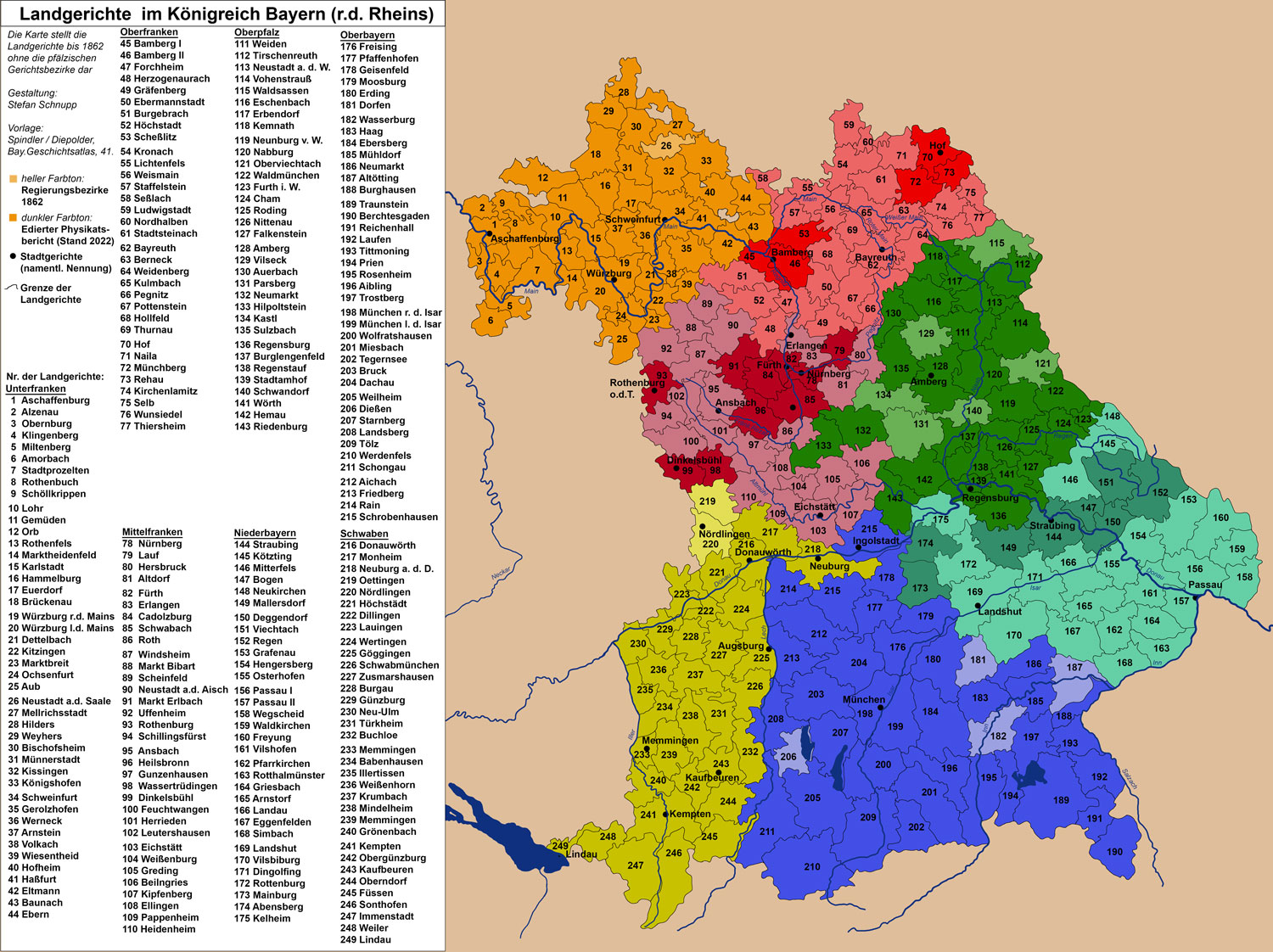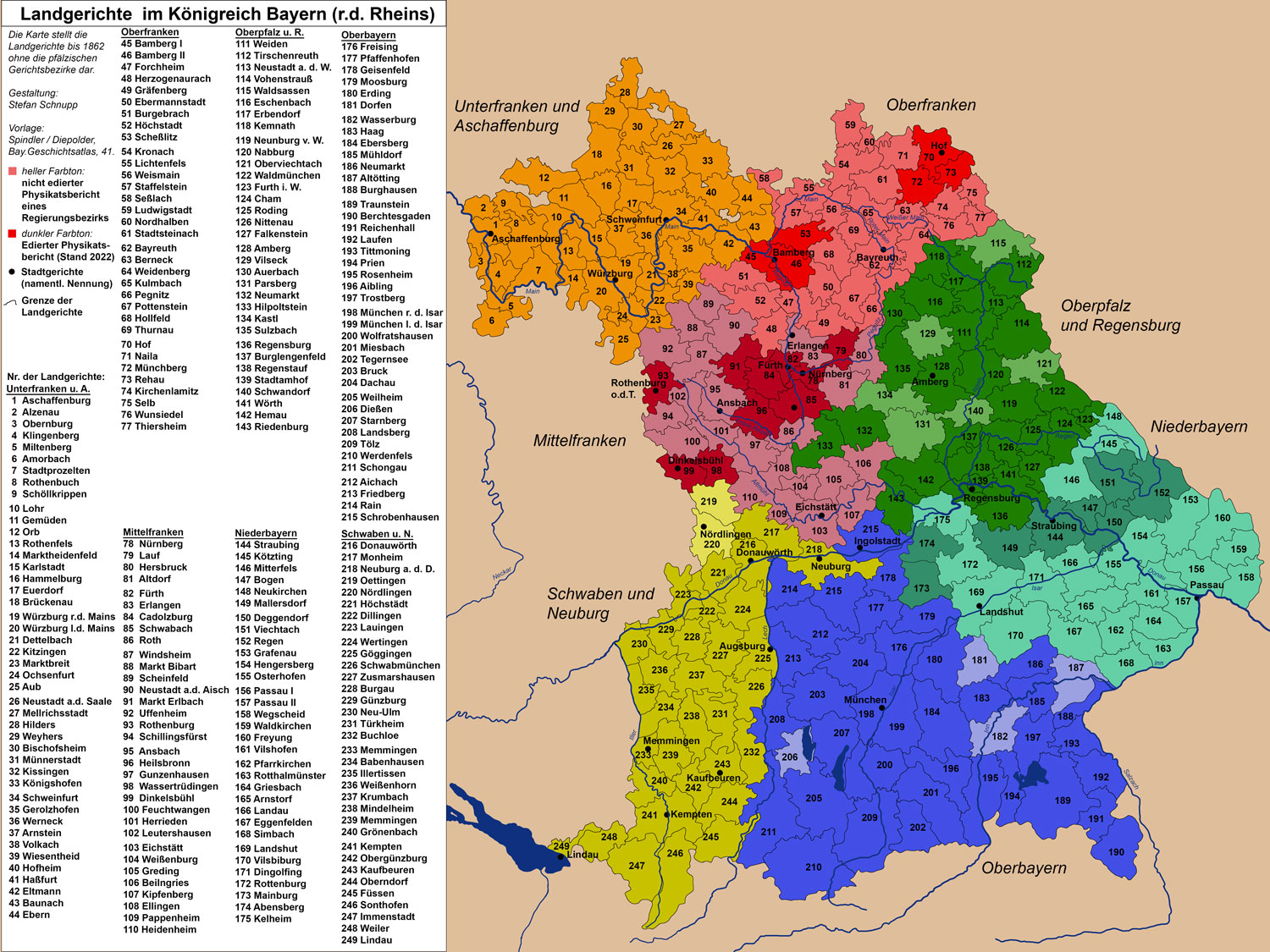 Landgerichte im Königreich Bayern (rechts des Rheins) im Jahr 1862. Die Karte stellt auch die edierten Physikatsberichte dar (Stand 2022). (Gestaltung: Stefan Schnupp, Vorlage: Spindler/Diepolder, Bay. Geschichtsatlas, 41) HLB