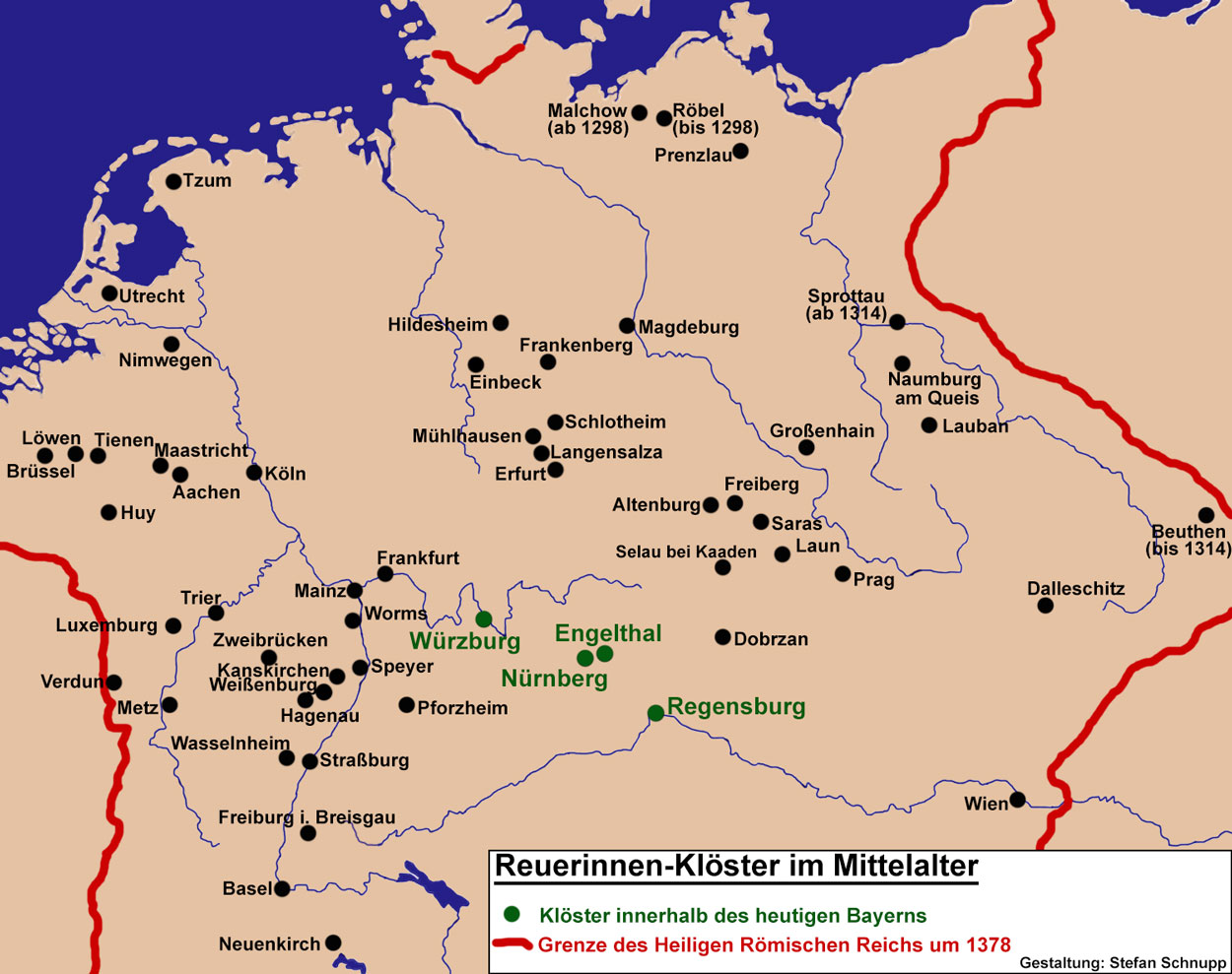 Klöster der Reuerinnen im Mittelalter auf dem Gebiet des Heiligen Römischen Reiches. Herrn Hauke Hillebrecht herzlichen Dank für die zahlreichen Hinweise. (Gestaltung: Stefan Schnupp)