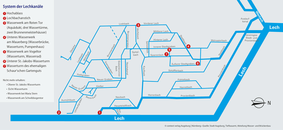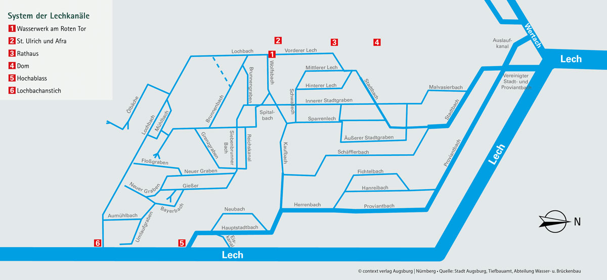 Schemakarte des Systems der Lechkanäle in Augsburg. (context verlag Augsburg/Nürnberg) HLB